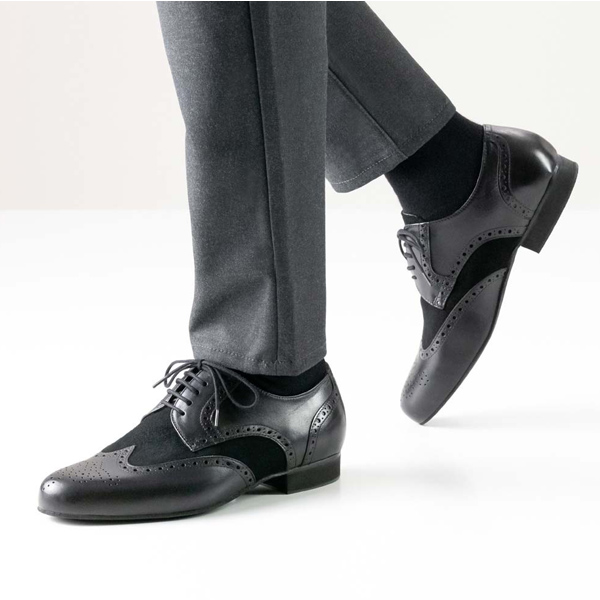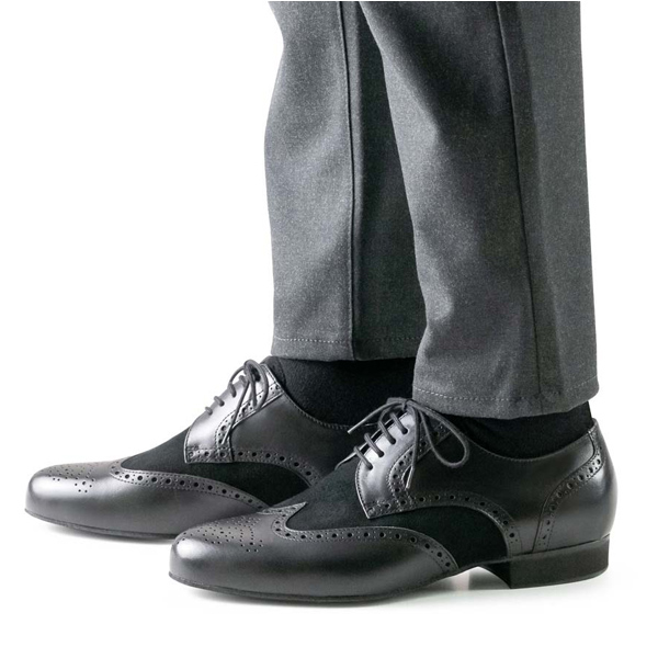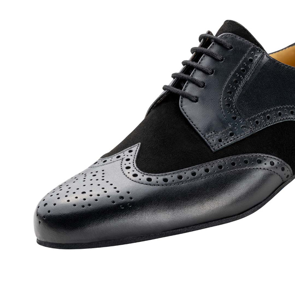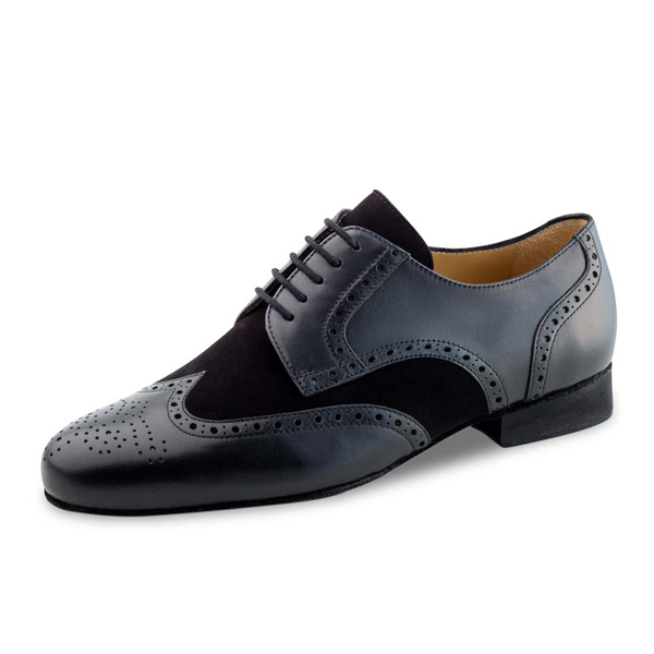Chaussure de danse Remo de Werner Kern classique et élégante pour hommes dans une précieuse combinaison nappa/nubuk. Ce modèle convient spécialement aux pieds largesLe bout golf à l'avant perforé à la main donne à cette chaussure son aspect élégant. Le talon légèrement surélevé et biseauté associé au laçage confortable à 5 trous offre un ajustement optimal et sûr avec des oeillets cachés sans nickel. La chaussure est doublée de cuir de veau souple de qualité.